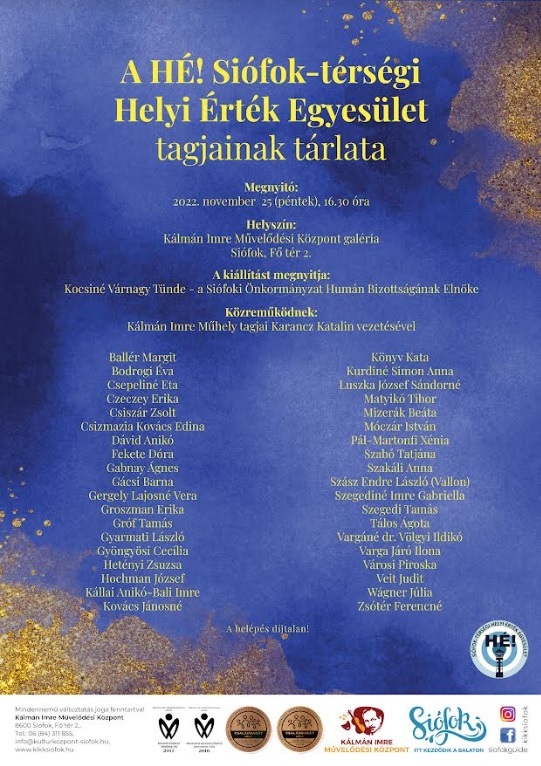 Siófokon a Kulturális Központ emeleti galériáján, tegnap délután a városnapi rendezvénysorozat keretén belül, kiállítás nyílit a HÉ! Siófok-térségi Helyi Érték Egyesület profi és feltörekvő amatőr alkotói műveiből. A kiállítás a Kulturális Központ nyitvatartási idejében márciusig megtekinthető.